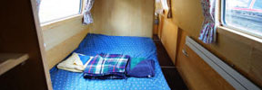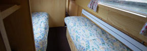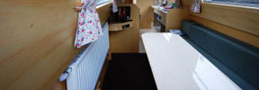 The saloon at the front has an L-shaped settee with a table which can be hidden away when not required. The settee converts either to a double bed or to two singles. There are large drawers under the settee.
