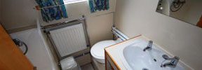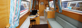 The back end is cruiser style with a handrail. The master bedroom has a fixed double bed (our special one-poster design) with sprung mattress, drawers under, a wardrobe, wet locker and airing cupboard. The bathroom has a shower bath, toilet, basin with shelves, and radiator. There are dividing doors in the corridor. The middle bedroom is in two compartments with a dividing door. Each has a fixed single bed, over which an optional top bunk can be fitted. The mattresses are foam covered with cloth. There are drawers and storage under the beds, with shelves and a hanging space. The forward toilet has a washbasin and shelf. The galley has a fitted cooker (with 4 burners, grill and oven), fridge, microwave and lots of storage. The saloon at the front has an L-shaped settee with a table which can be hidden away when not required. The settee converts either to a double bed or to two singles. There are large drawers under the settee. Radio CD player with 4 speakers, and TV/DVD player. The front cockpit has seats either side. An inverter proves 240v AC, to power any of your own normal mains appliances up to 1000 watts. There is mains hair dryer (more powerful than on other boats). The engine is an Isuzu 4-cylinder water-cooled diesel.