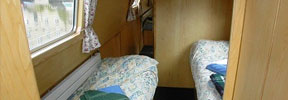 The saloon at the front has an L-shaped settee with a table which can be hidden away when not required. The settee converts either to a double bed or to two singles. There are large drawers under the settee.