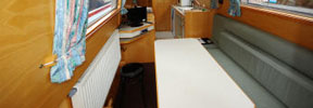 The back end is cruiser style with a handrail. The master bedroom has a fixed double bed (our special one-poster design) with sprung mattress, drawers under, a wardrobe, wet locker and airing cupboard. The bathroom has a shower bath, toilet, basin with shelves, and radiator. There are dividing doors in the corridor. The middle bedroom is in two compartments with a dividing door. Each has a fixed single bed, over which an optional top bunk can be fitted. The mattresses are foam covered with cloth. There are drawers and storage under the beds, with shelves and a hanging space. The forward toilet has a washbasin and shelf. The galley has a fitted cooker (with 4 burners, grill and oven), fridge, microwave and lots of storage. The saloon at the front has an L-shaped settee with a table which can be hidden away when not required. The settee converts either to a double bed or to two singles. There are large drawers under the settee. Radio CD player with 4 speakers, and TV/DVD player. The front cockpit has seats either side. An inverter proves 240v AC, to power any of your own normal mains appliances up to 1000 watts. There is mains hair dryer (more powerful than on other boats). The engine is an Isuzu 4-cylinder water-cooled diesel.